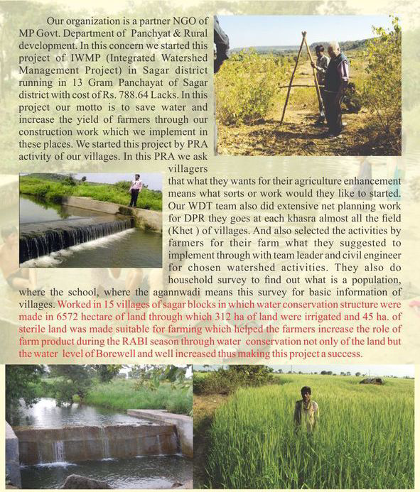 We have worked in 15 villages of sagar blocks in which water conservation structure were made in 6572 hectare of land through which 312 ha of land were irrigated and 45 ha of sterile land was made suitable for farming helped the farmers increase the role of farm product during the RABI season through water conservation not only of the land but the water level of Borewell and well increased thus making this project a success.